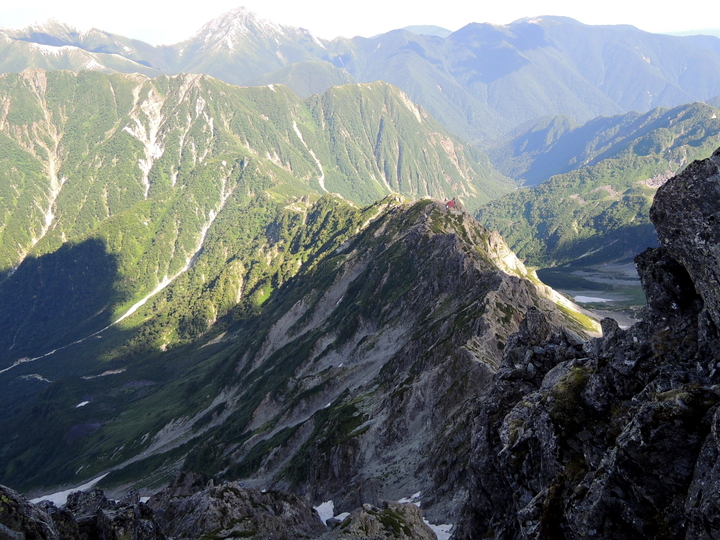 東鎌尾根の上に見える赤い屋根はヒュッテ大槍。