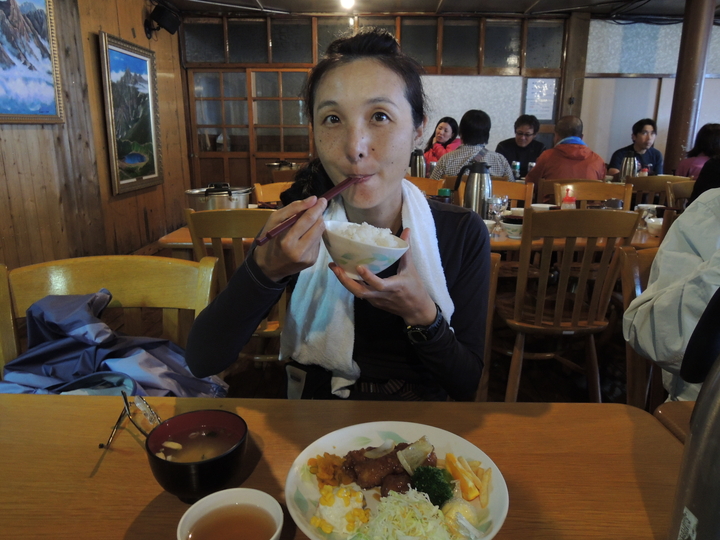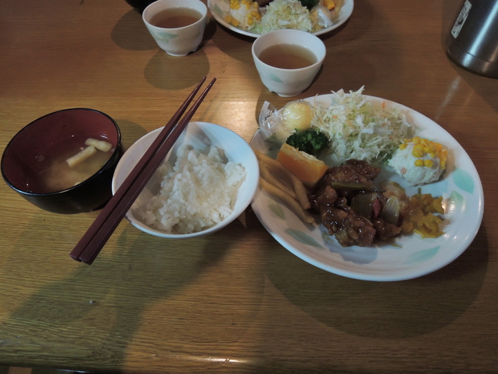 献立は酢豚、ポテトサラダ、味噌汁など。山では贅沢は言えないので、まあ十分かなという感じ。