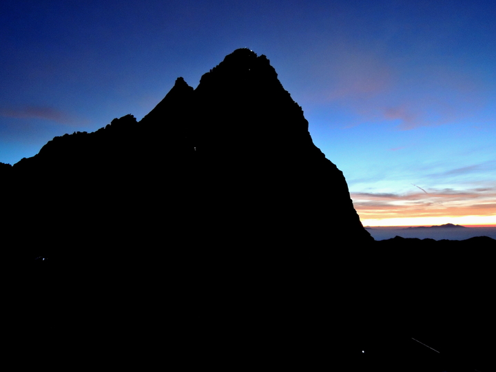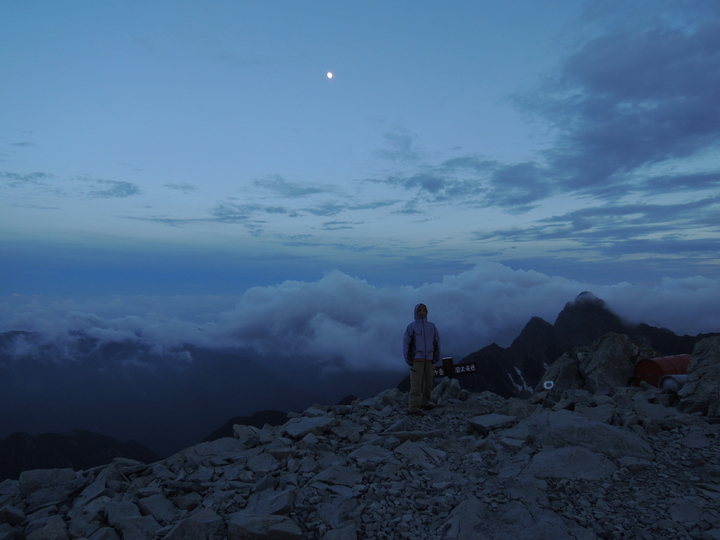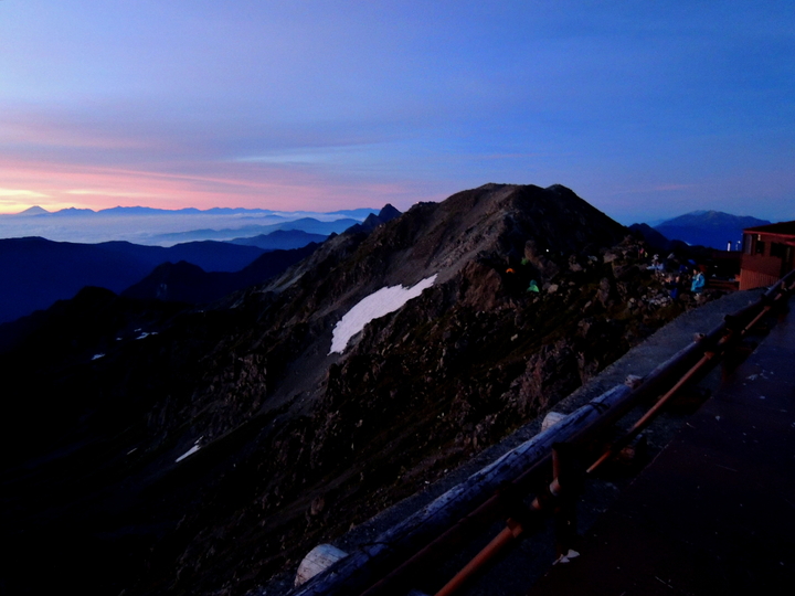 4時半に外に出ると、すでに槍ヶ岳の山頂にヘッドライトの光があった。