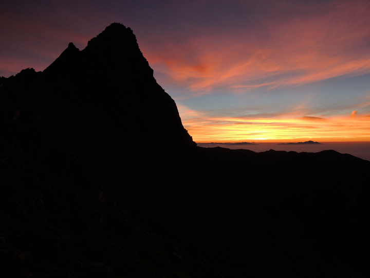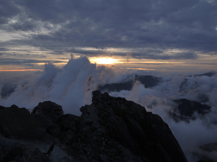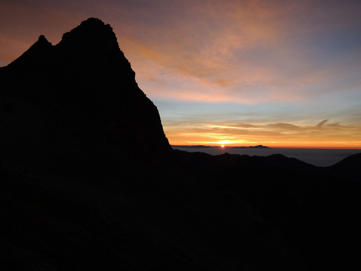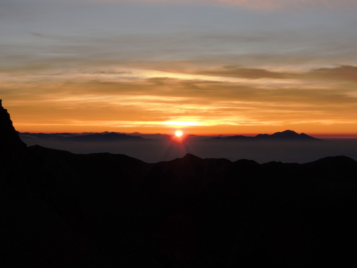 5:12 御来光は穂先の右から。山頂で日の出を眺めると、毎回格別な喜びを感じる。景色が美しいのはもちろんだが、それ以上に心が洗われて生まれ変われるような希望を感じられるのがよい。