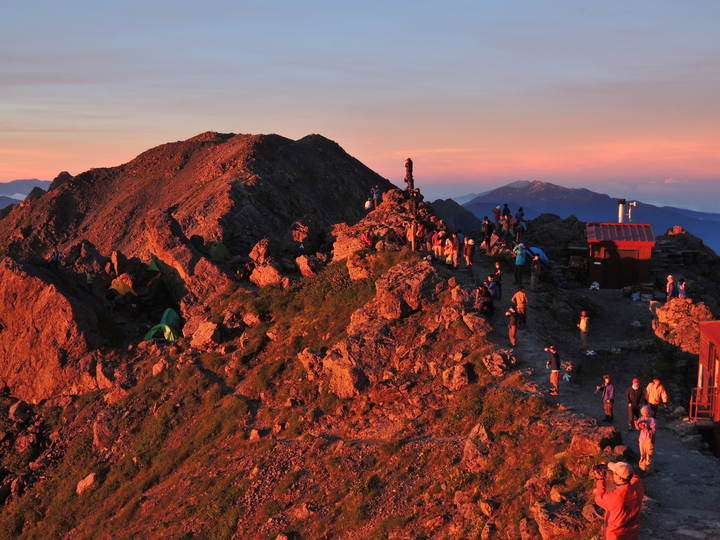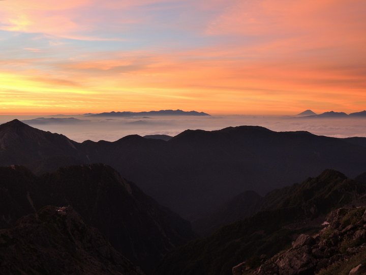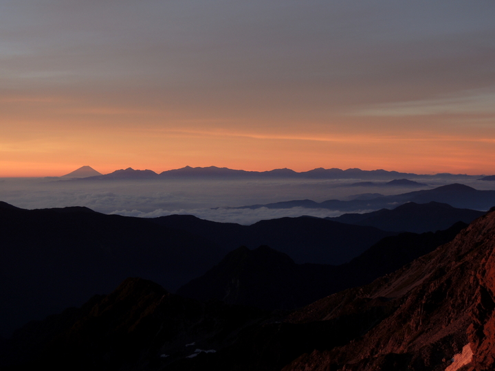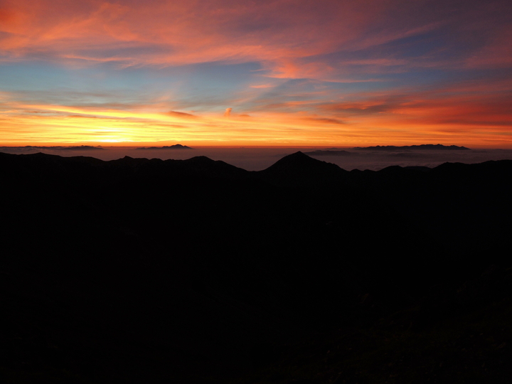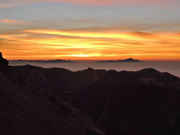 日の出前の朝焼けは見事だった。東の雲海には本白根山、四阿山、浅間山などが浮かび、常念岳の影の右には、美ヶ原と八ヶ岳の峰々が見える。