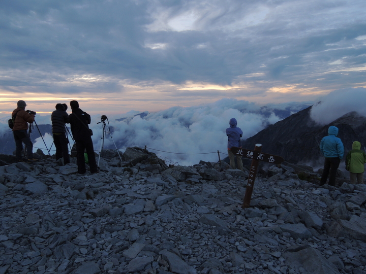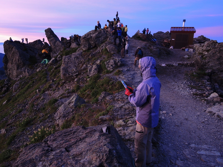 5時過ぎの日の出時間に合わせて、稜線上に陣取るハイカーたちが増えてきた。