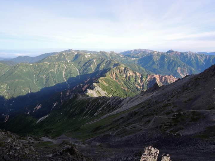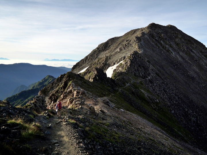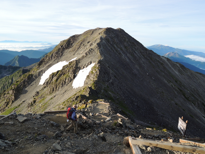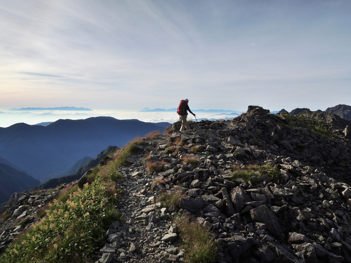 7:00 大喰岳を出発。西の方角には笠ヶ岳が見えていた。