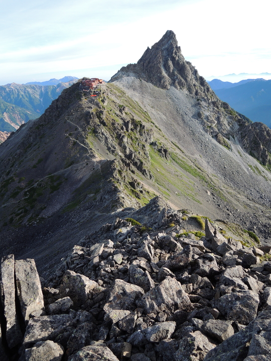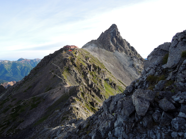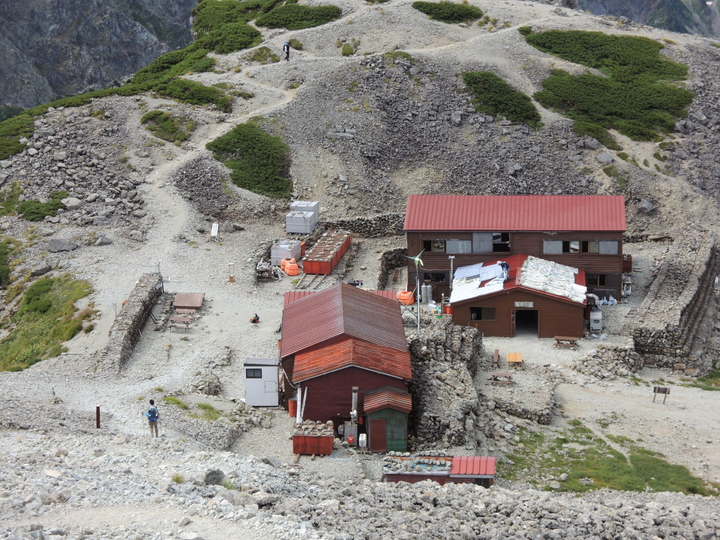 振り返って眺めた槍ヶ岳と山荘。左下にのびるのが飛騨沢へ下る道。
