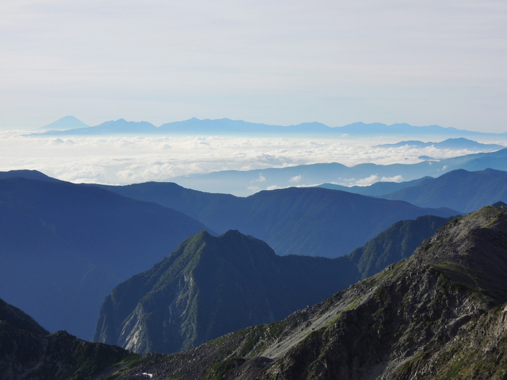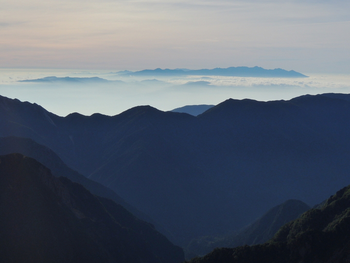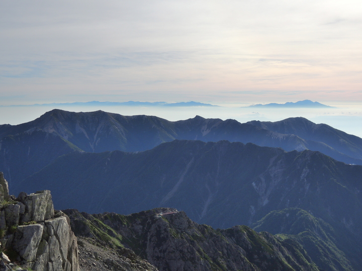 東側の雲海に浮かぶ岩管山、横手山、草津白根山、四阿山、浅間山。真ん中は大天井岳から横通岳の稜線で、その手前は赤岩岳から西岳の稜線。