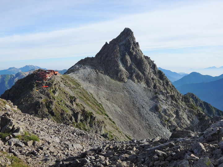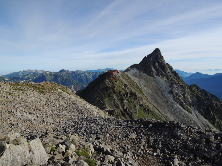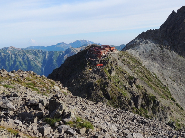 槍ヶ岳山荘の左上には立山がくっきり見えていた。