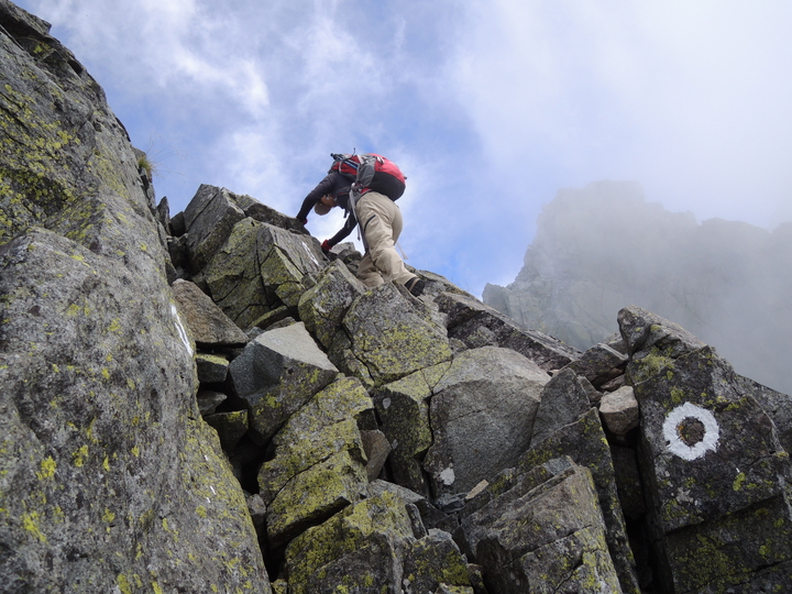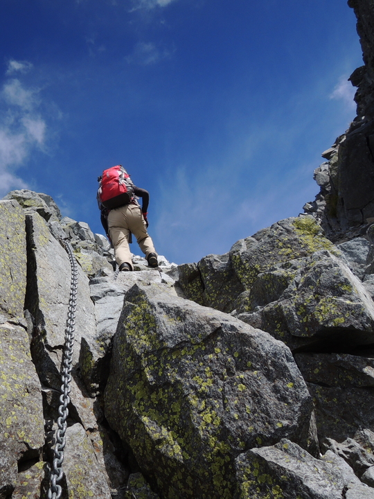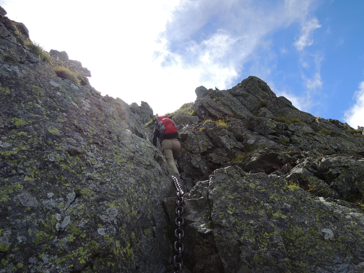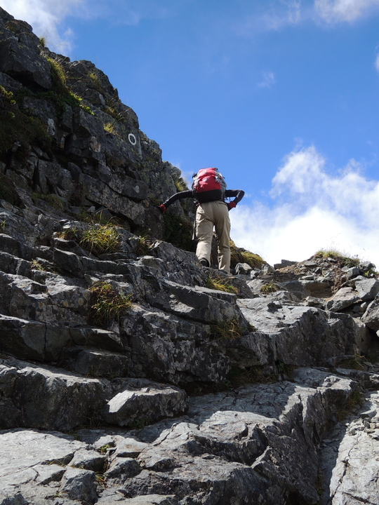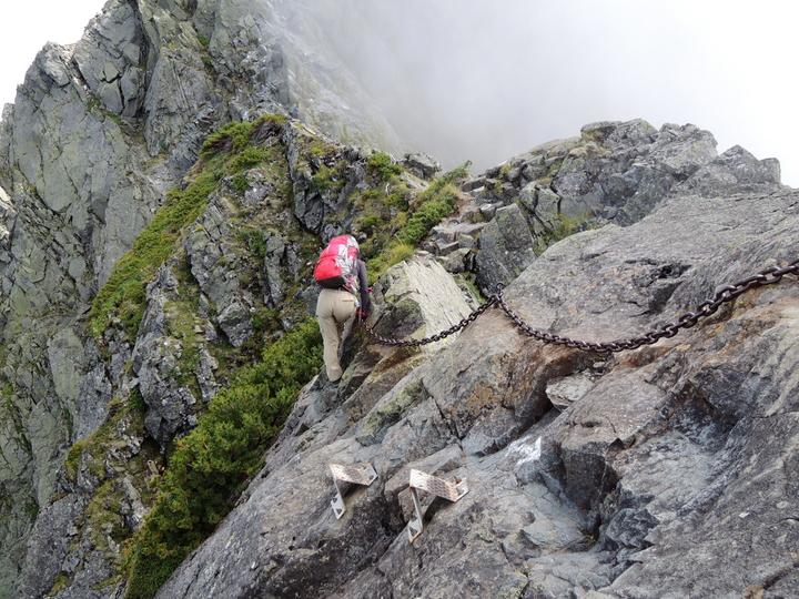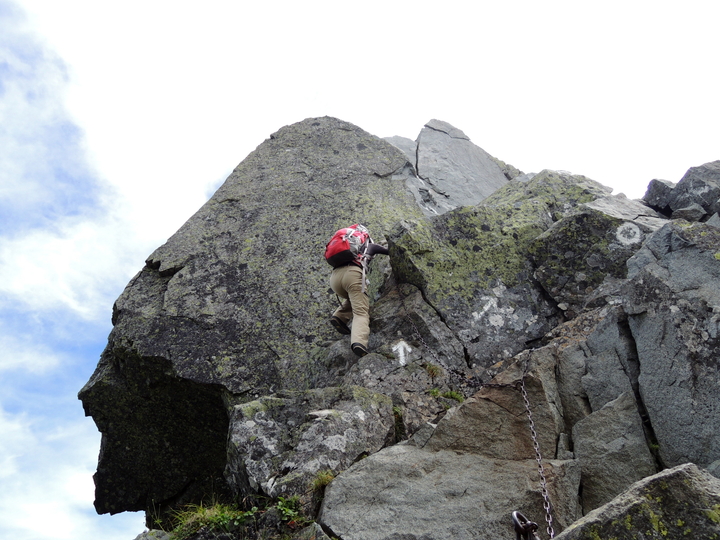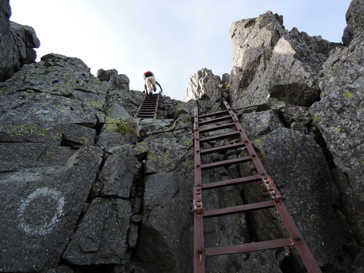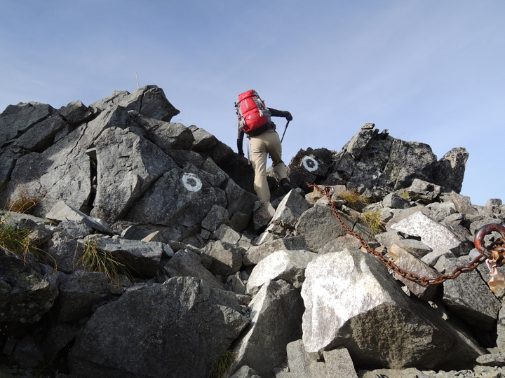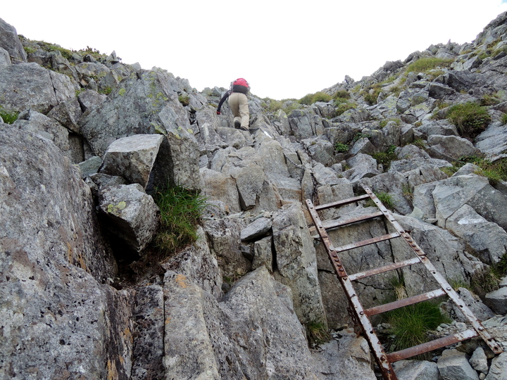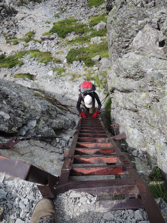 岩場の急登には、梯子とクサリ、さらには鉄杭も打たれていた。