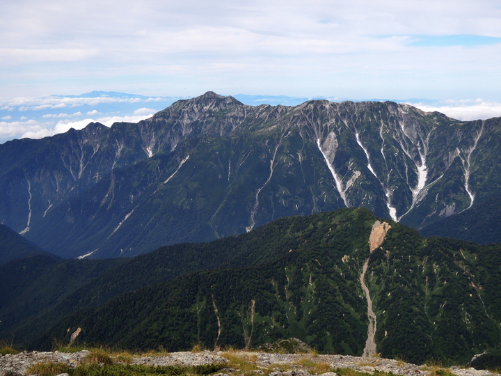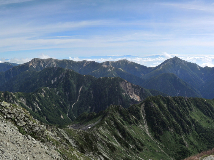 北西側。左から黒部五郎岳、三俣蓮華岳、薬師岳、水晶岳と続く。黒部五郎岳の右手前は双六岳で、そこから逆S字に樅沢岳と西鎌尾根の稜線が左手前まで延びている。なだらかな薬師岳の右手前は鷲羽岳。