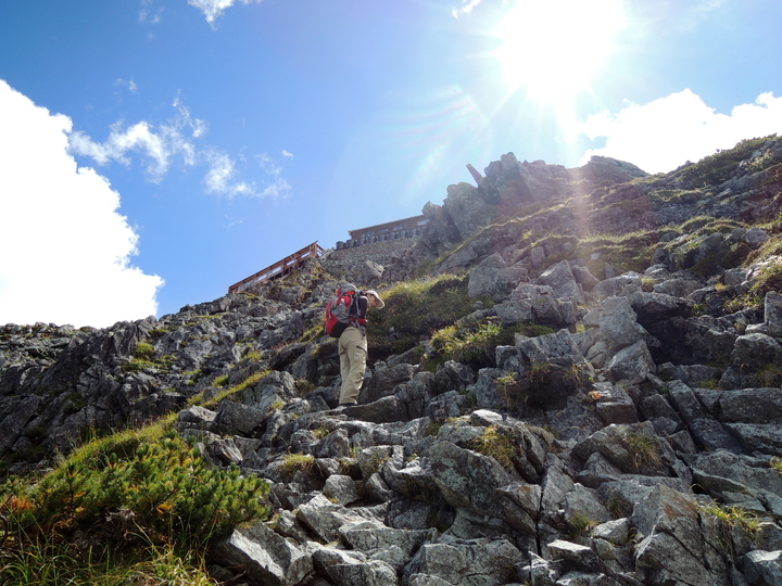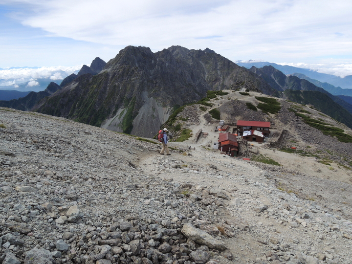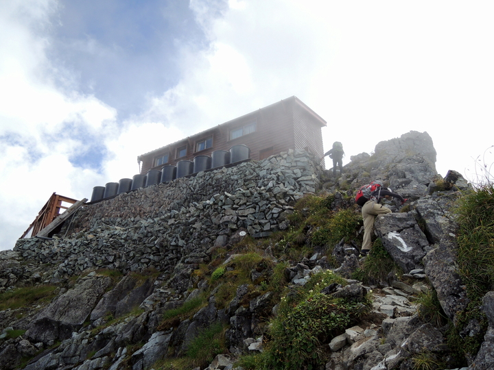 やっと北穂高岳の頂に北穂高小屋が見えてきた。