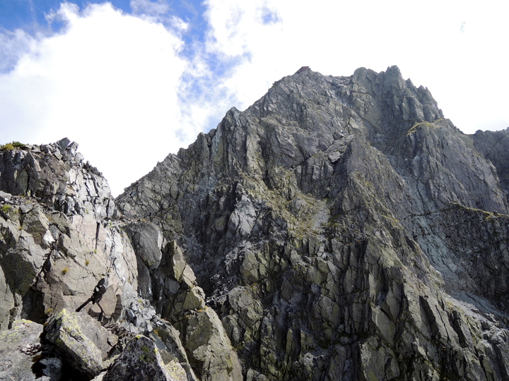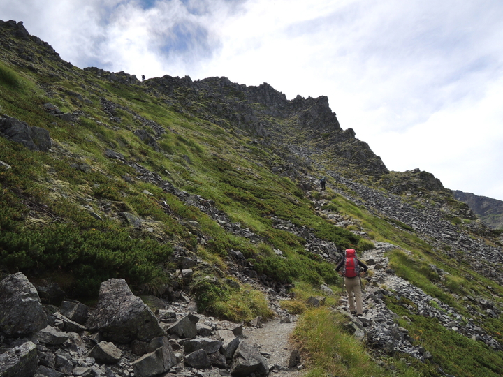 下からは山頂のように見えていた岩峰を巻いて行く。まだまだ遠い。