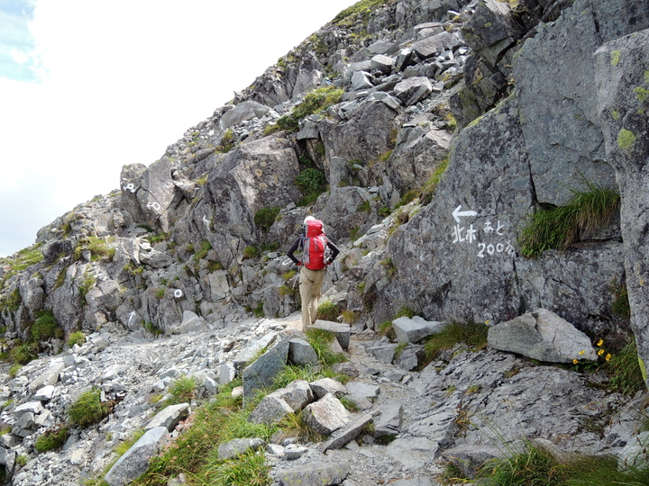 「北ホ あと200m」の文字を目にして一瞬思考に空白が生じ、距離じゃなくて標高差と認識。まだそんなにあるのかと、励ましよりも落胆を感じた。