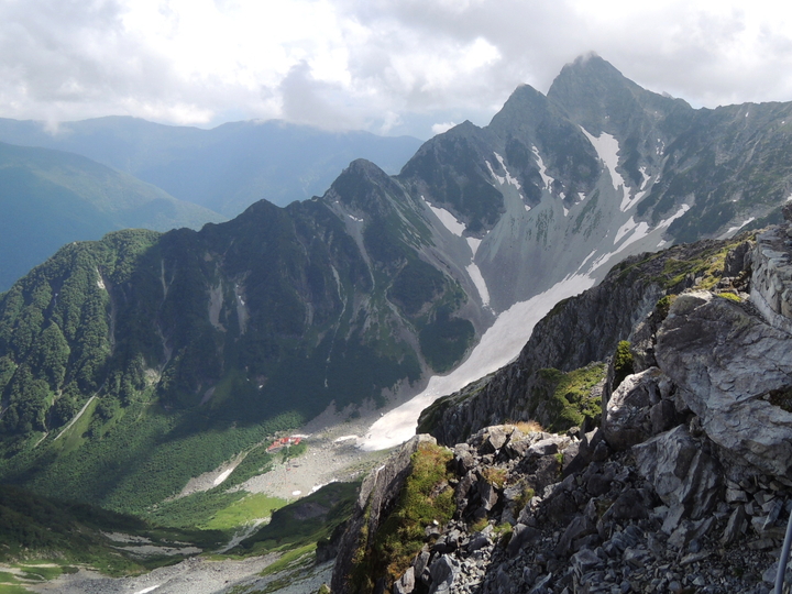 中岳カールには雪渓があり、水場もあるらしいが、どこにあるかは分からなかった。背後には中岳、大喰岳、槍ヶ岳と続く稜線。