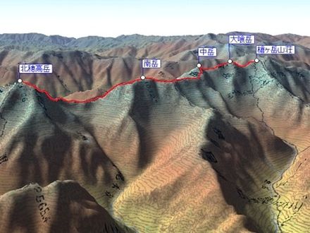 槍ヶ岳山荘 6:10 ⇒ 6:45 大喰岳 7:00 ⇒ 7:45 中岳 7:55 ⇒ 9:10 南岳 9:20 ⇒ 9:25 南岳小屋 9:40 ⇒ 長谷川ピーク 11:25 ⇒ 11:45 A沢のコル 11:55 ⇒ 北穂高小屋 13:35