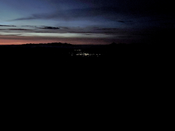 4時過ぎに外に出ると、満天の星空が広がっており、南東方向には町の明かりも見えていた。夜明け前のデッキで、この日の長丁場に備えてテーピングをした。