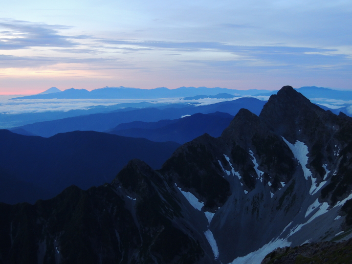 複数の尖峰が連なる前穂高岳の向こうには、富士山と南アルプス。