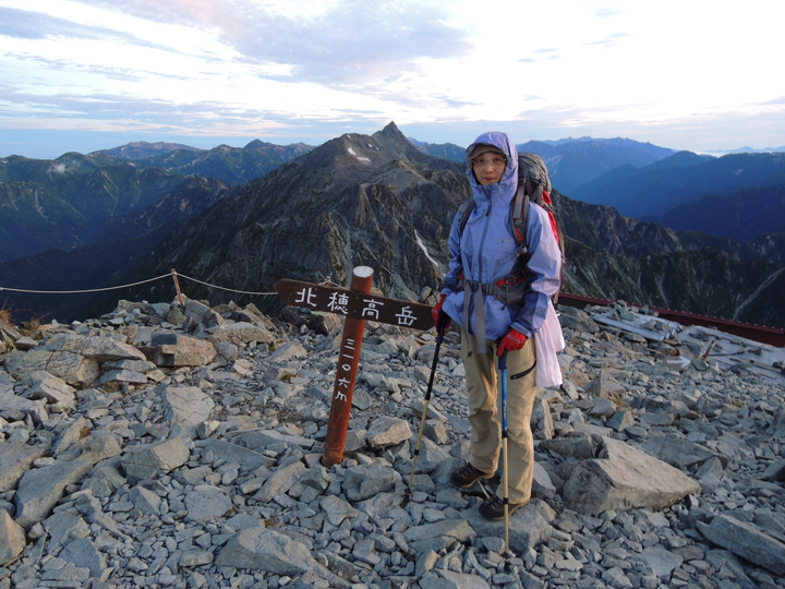 背後には北穂高岳の南峰と北峰、そして槍ヶ岳が見えていた。