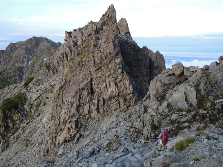 涸沢のコル(最低コル)まで下り、すぐ先の亀岩と呼ばれる脆い岩が積み重なった岩峰を上る。