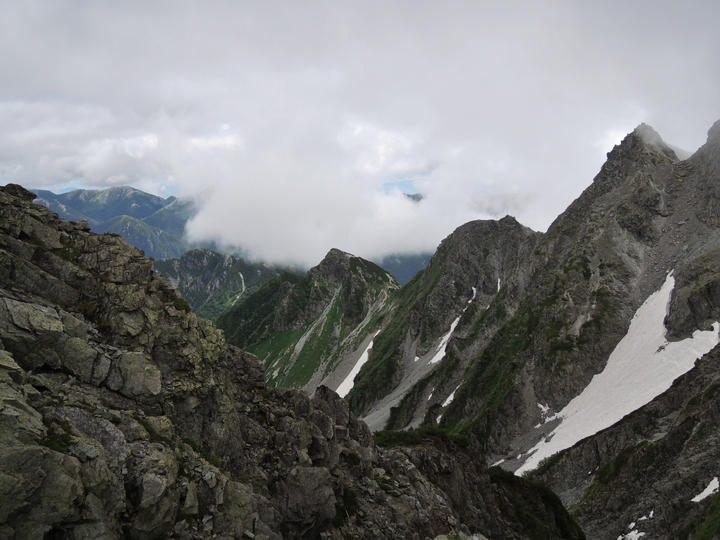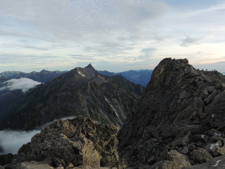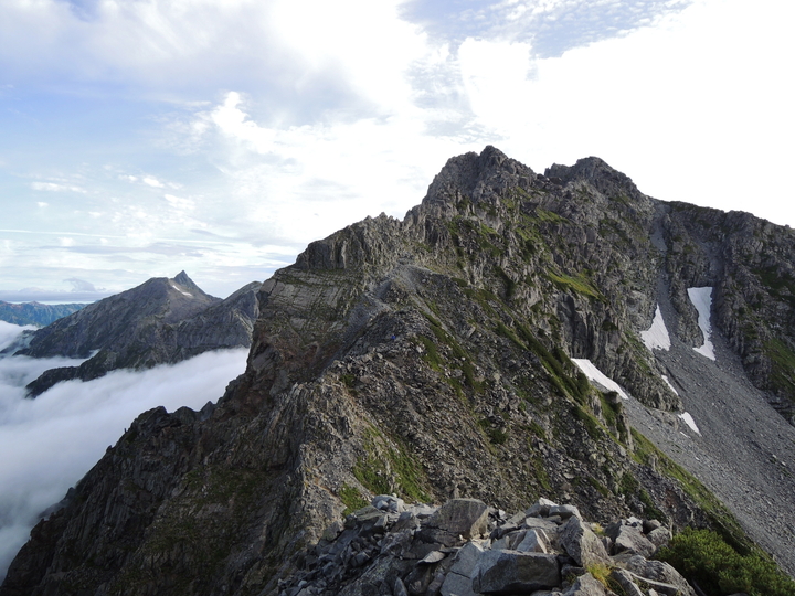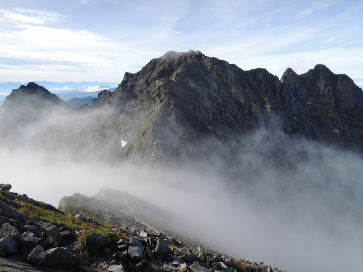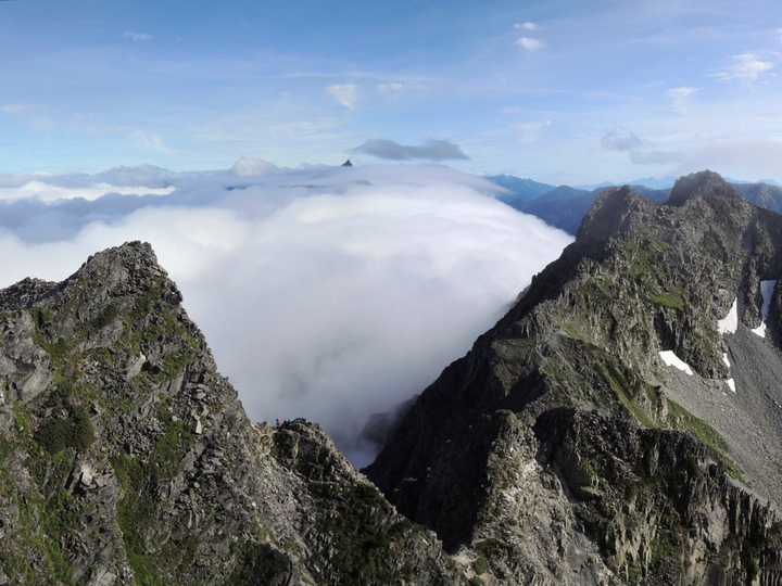 北穂高岳(右)の向こうに見えるはずの南岳と大喰岳は完全に雲の中。槍ヶ岳の穂先だけが僅かに見えていた。