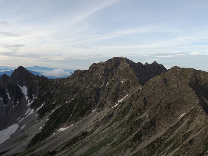 昨日はガスで見れなかった槍ヶ岳から続く稜線と大キレットの全貌。来てよかったと、深く感じ入る瞬間だった。