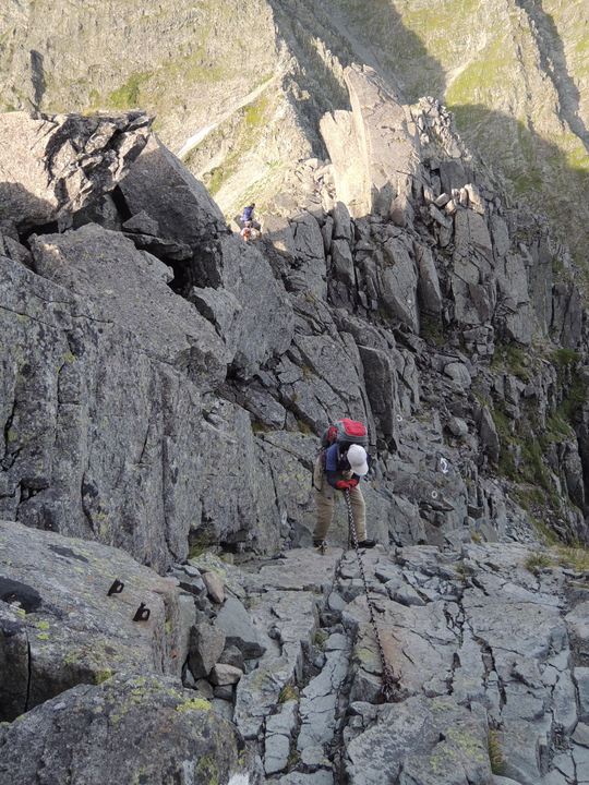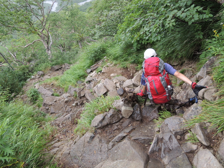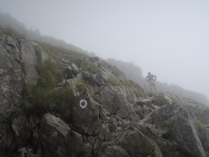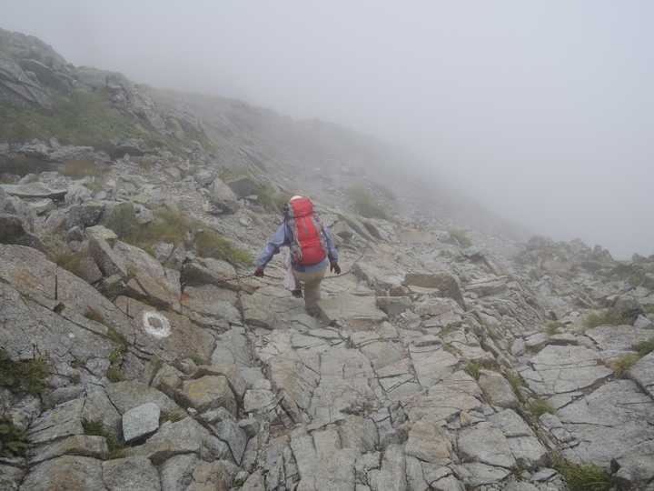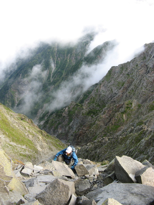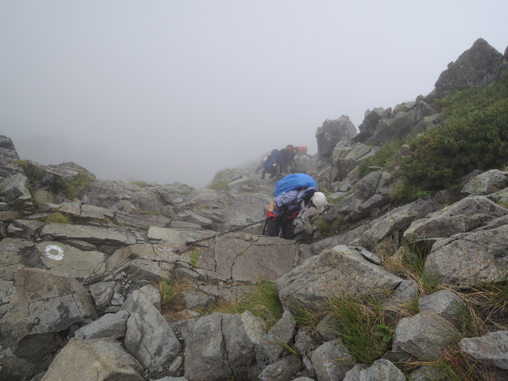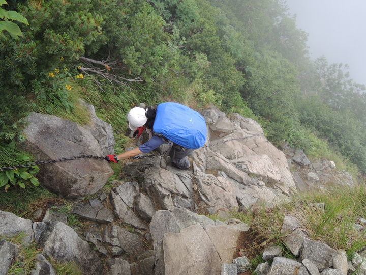 出発してすぐ長いクサリ場。岩が雨で濡れるとまるで条件が変わってくる。いつにも増して慎重に下る。