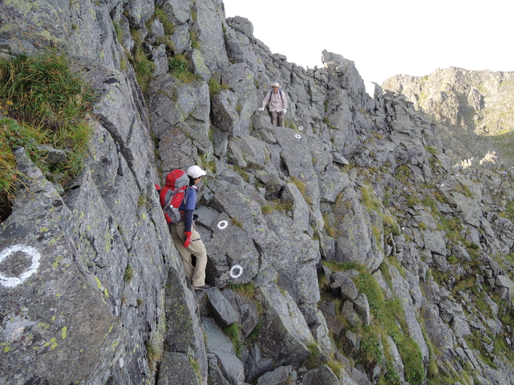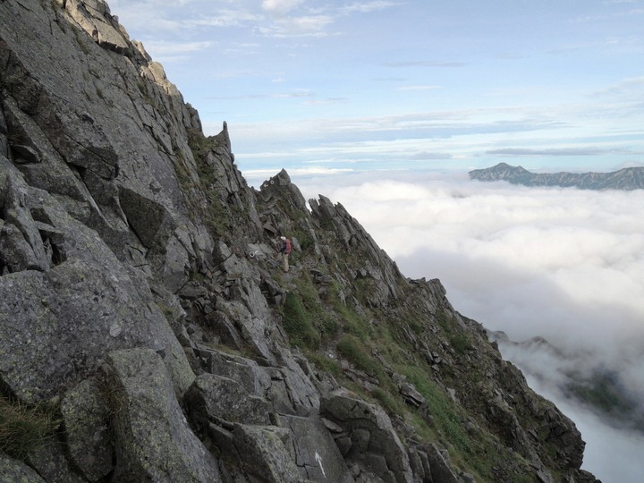 この辺りから奥壁バンドといわれる難所が続く。右側は滝谷がすっぱり切れ落ちている。