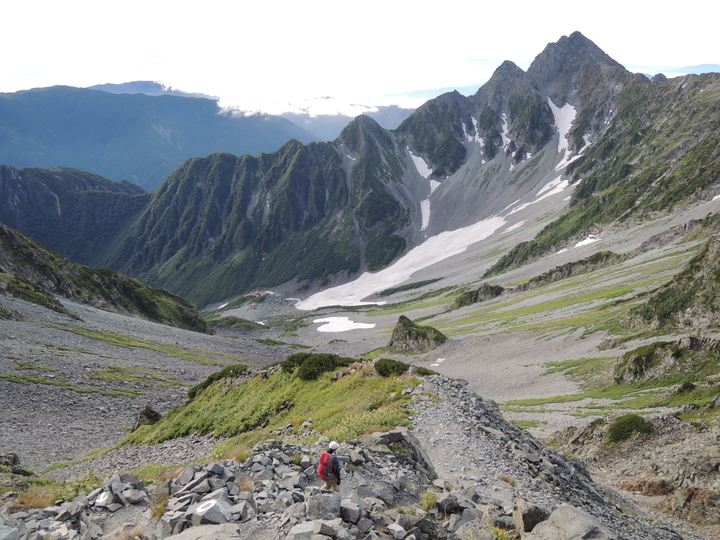 前方に滝谷ドームの岩峰を望みながら急な岩場を下る。