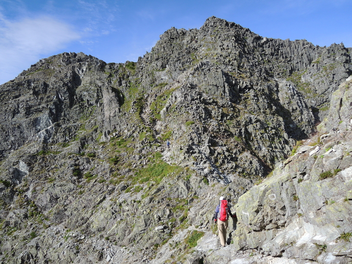 北穂高岳南峰の尖頭を左に巻いて進む。