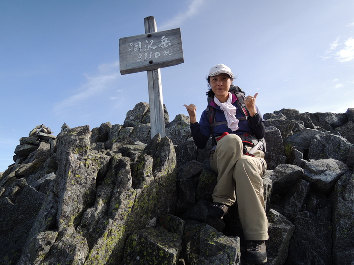 やっと涸沢岳の稜線に出ると、すぐ先に山頂標が見えた。