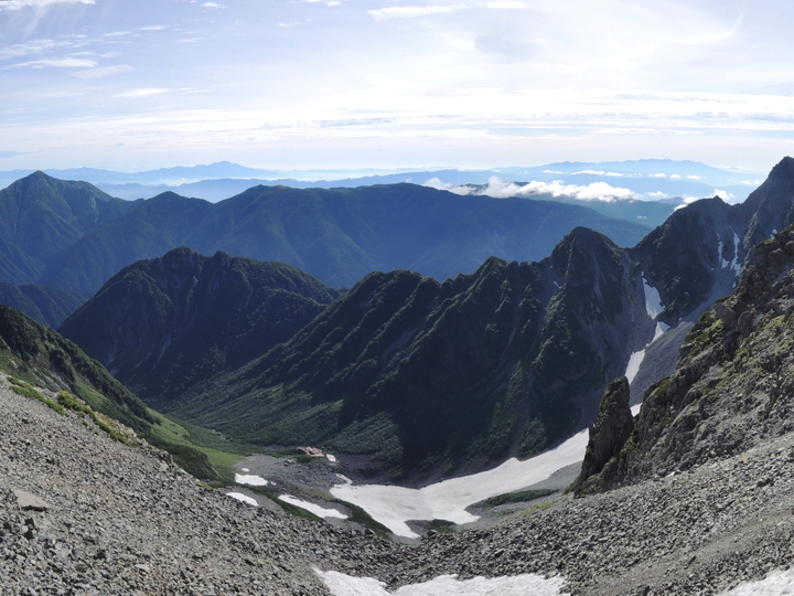 " width="712" height="441" border="0"> 穂高岳山荘から涸沢カールと雪渓を見下ろす。左端の前穂高岳から屏風ノ頭まで北尾根がのびており、その奥には常念岳(左端)から蝶槍、蝶ヶ岳と続く稜線。一番奥には浅間山と八ヶ岳も見える。