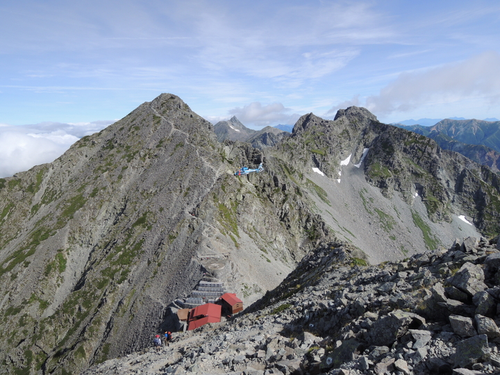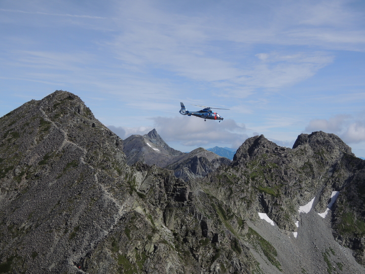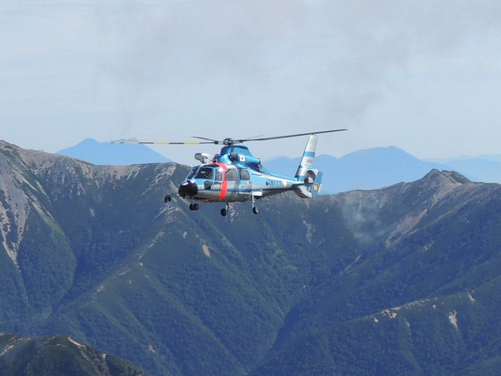 縦走してきた峰々と県警のヘリコプター。
