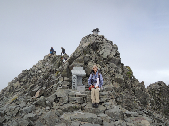 山頂の祠と大ケルン。写真を誰かに頼んでからケルンに上るので、混雑期に渋滞するのも納得。