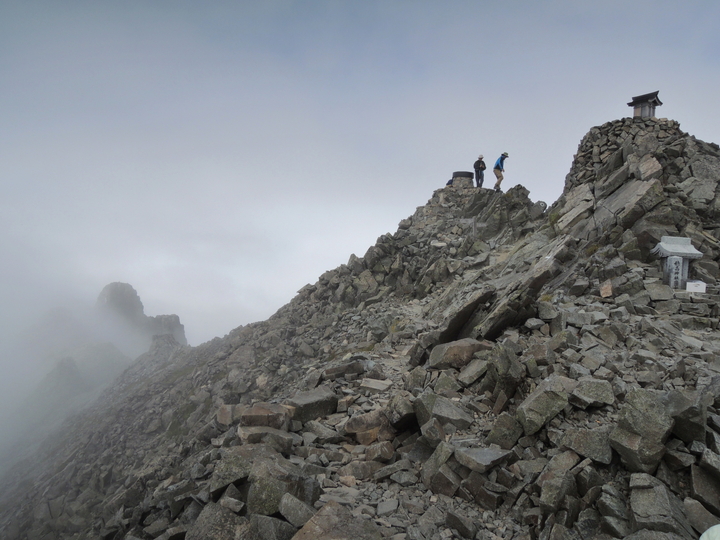 9:15 奥穂高岳の山頂に到着。タッチの差でガスに包まれてしまった。