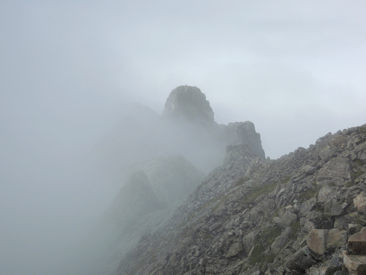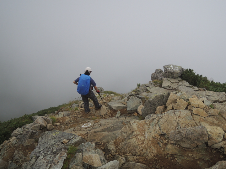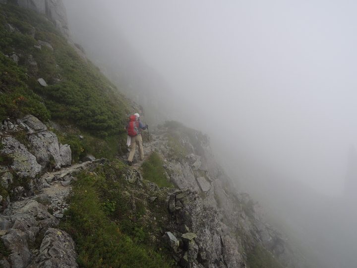 左右は切れ落ちているように感じるが、ガスで下が見えないので高度感はない。