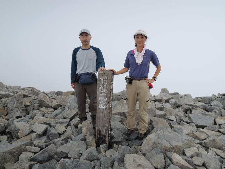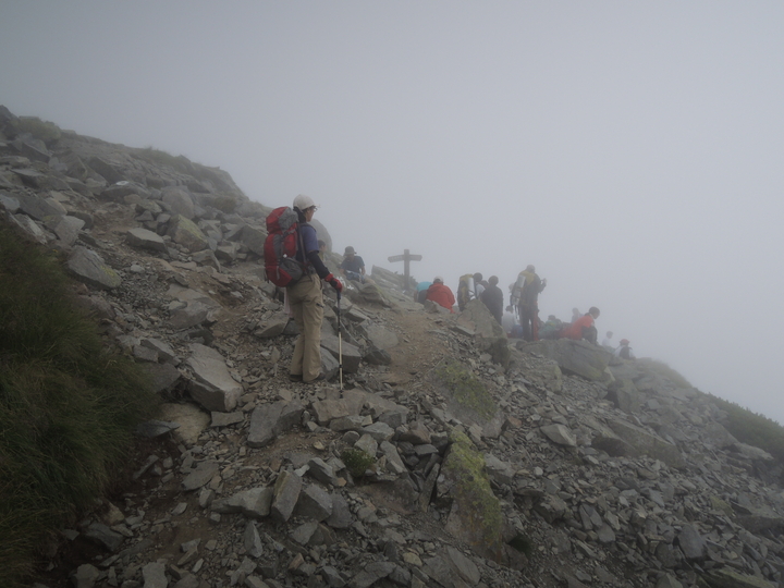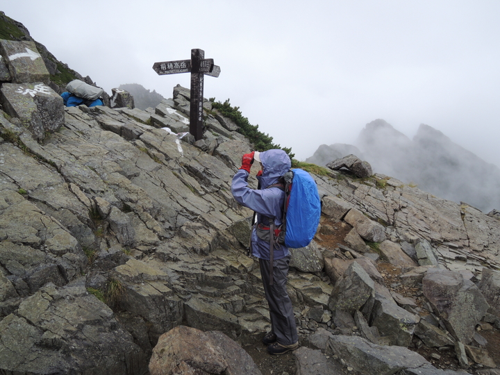 12:05 8座目の3,000m峰、前穂高岳に到着。周りは真っ白だったが、静かな喜びを感じた。