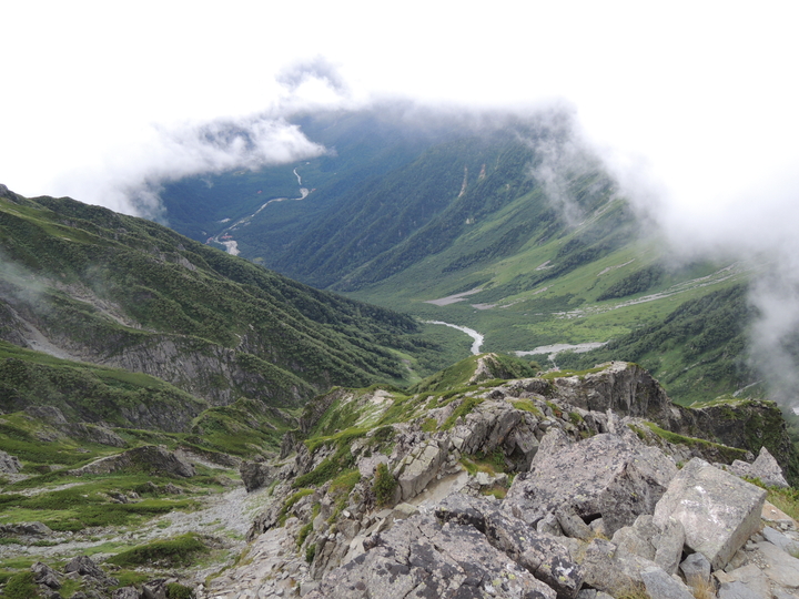 一瞬ふわっとガスが切れて、これから下る重太郎新道と岳沢、その先の上高地まで見えた。