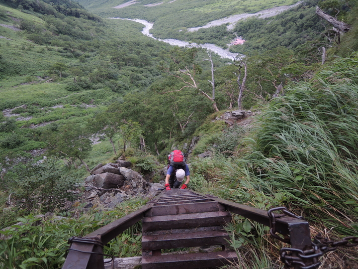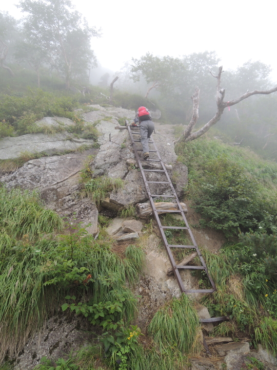 梯子を上り終えようとしている先行登山者の姿が下から見えた。