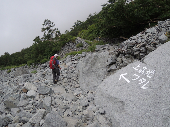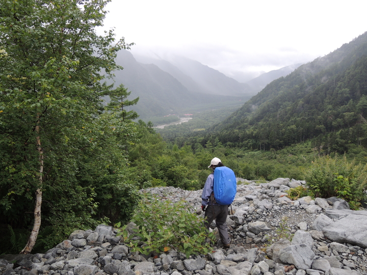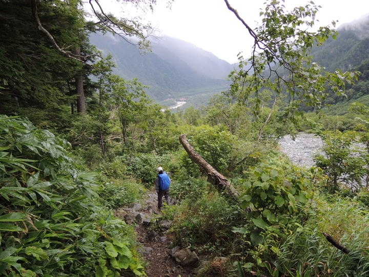 時折前方に見える上高地がなかなか近づいてこない。両膝に力が入らなくなってきたが、ひたすら歩くのみ。