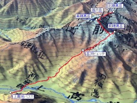 北穂高小屋 5:25 ⇒ 5:45 展望スポット 5:55 ⇒ 涸沢のコル 6:50 ⇒ 8:00 涸沢岳 8:05 ⇒ 8:20 奥穂高山荘 8:35 ⇒ 9:15 奥穂高岳 9:45 ⇒ 11:10 紀美子平 11:35 ⇒ 12:05 前穂高岳 12:15 ⇒ 12:45 紀美子平 12:50 ⇒ 14:50 岳沢ヒュッテ 15:00 ⇒ (休憩5分) ⇒ 16:50 河童橋 16:55 ⇒ 上高地バスターミナル 17:00