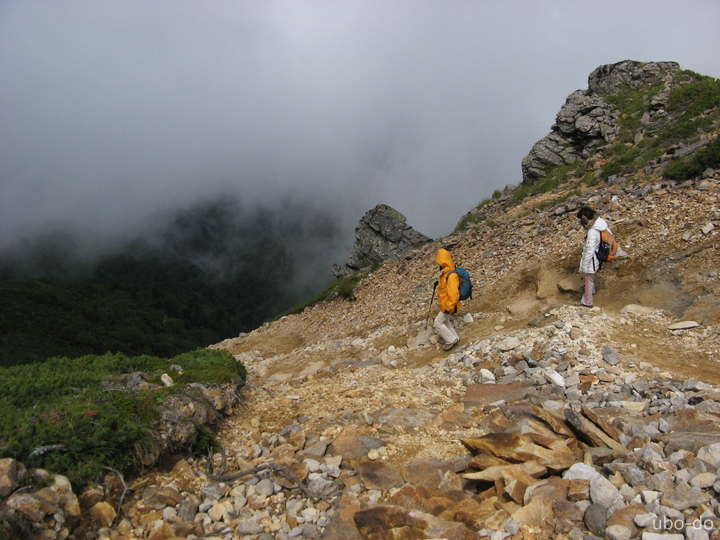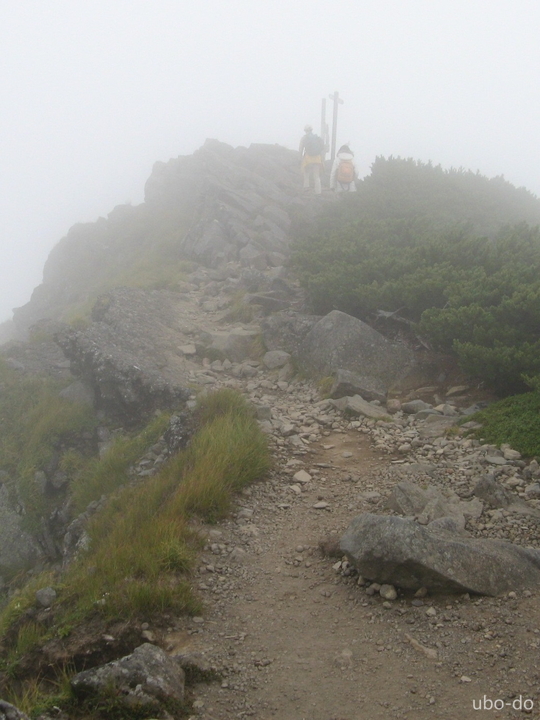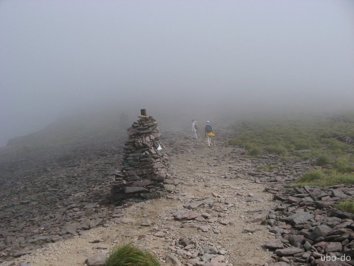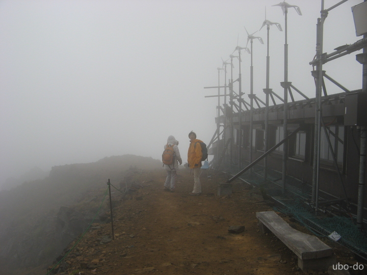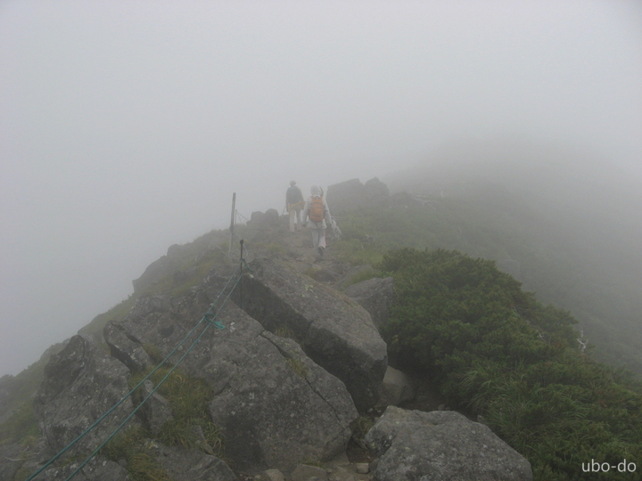 風が強く、西から東へ霧が流されていく。前を歩くハイカーの姿が霧で見えなくなるような状態が続いた。