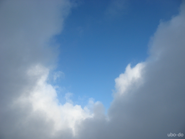 頭の上は青空がのぞいているのに、周囲は真っ白な霧の世界。