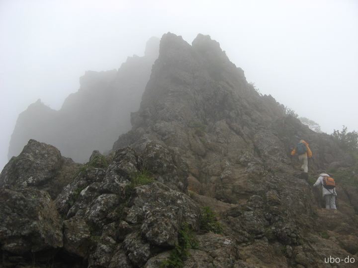鉾岳のコルに出て、さらに石尊峰へ続く岩場をよじ登る。