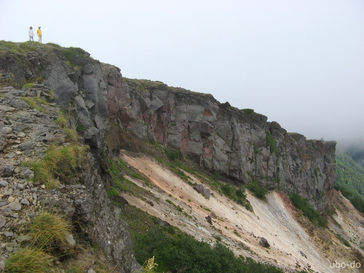 火口壁の周囲を歩いてまわるハイカーの姿もあった。下山時間を計算しながら霧が晴れるのを待った。