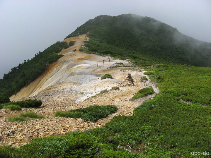 大ダルミの硫黄岳山荘もよく見えたが、あっという間に霧に隠れる。