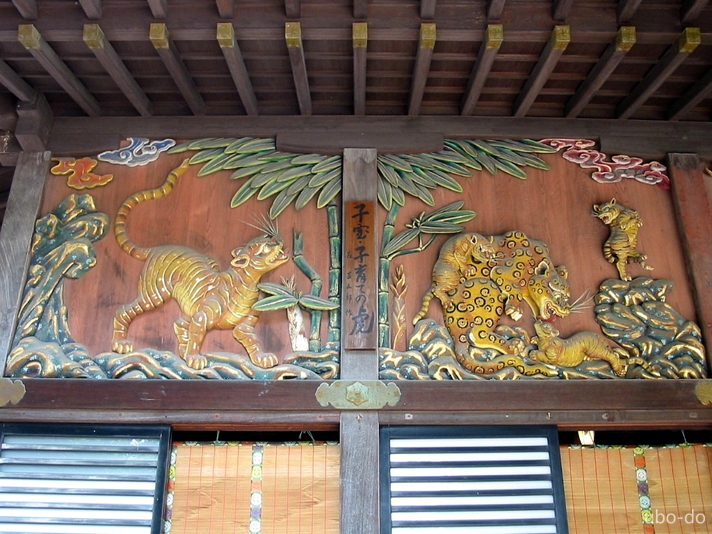 子虎と戯れる親虎の彫刻は、名工・左甚五郎作「子宝・子育ての虎」。
