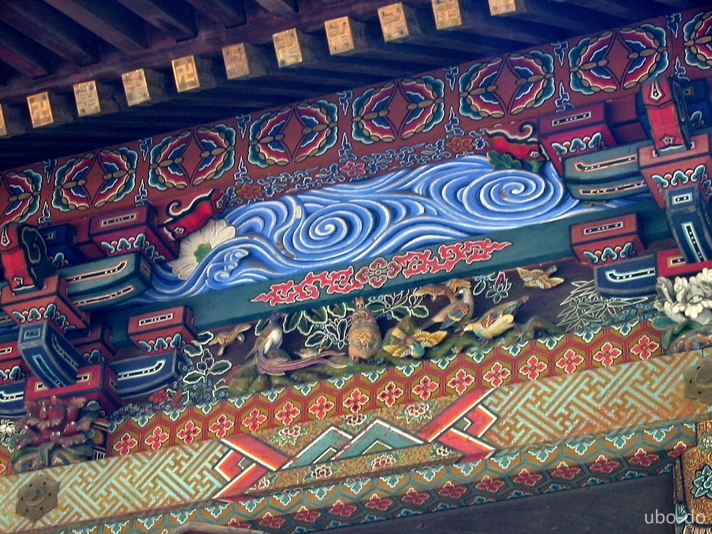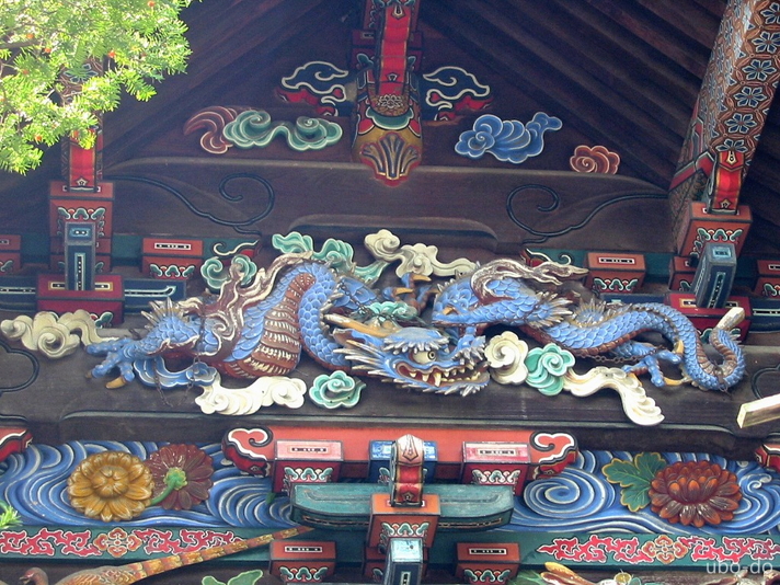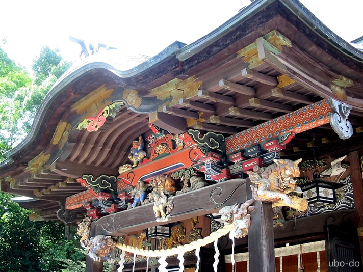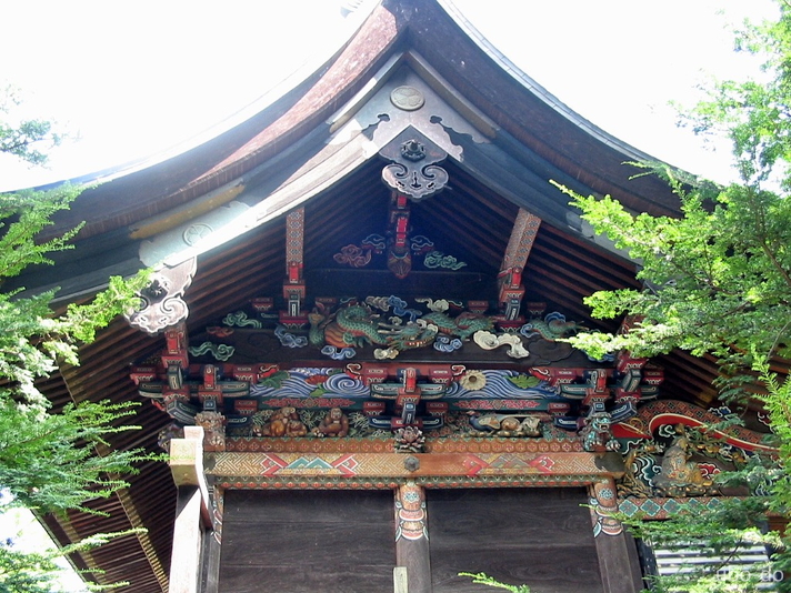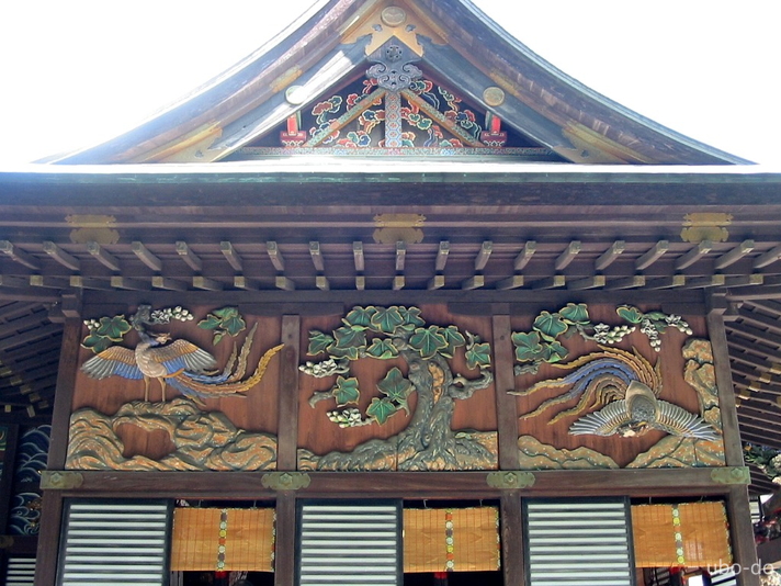 建物の壁に飾られた絢爛豪華な彫刻が、社殿を一層華やかなものにしている。