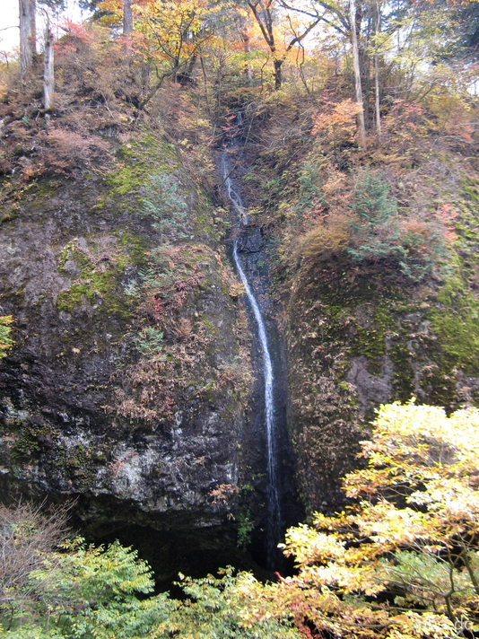 川向かいの崖に見える「瓶子滝 (みすずのたき)」。滝の両側の岩が神酒を入れる器 (瓶子) に見えることからそう呼ばれている。