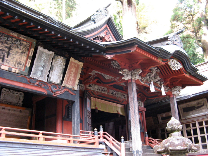 構成は権現造系統の複合社殿で朱と黒の漆塗りとなっている。