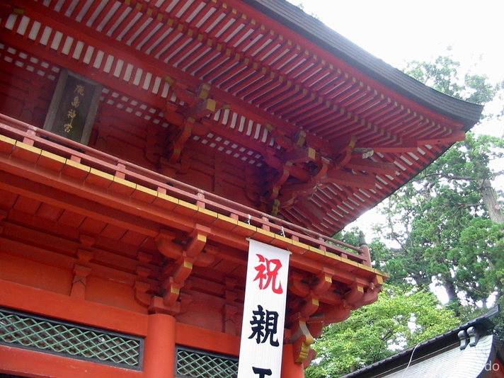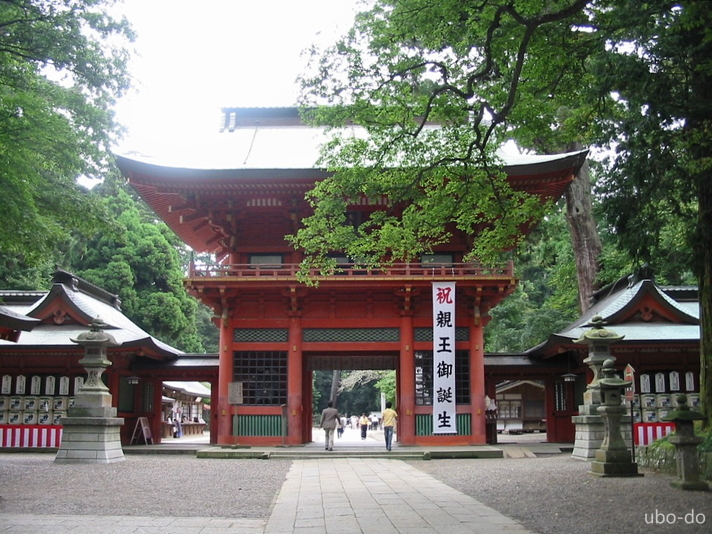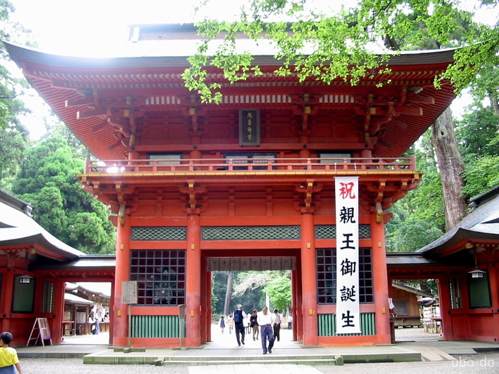 総朱漆塗りの二階建ての楼門は、寛永11年(1634)に初代水戸藩主・徳川頼房により奉納された。頼房公は水戸黄門光圀公の父親。