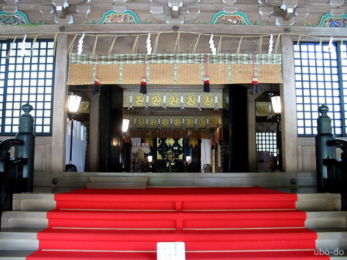 拝殿の中の様子。拝殿は白木作りの簡素な意匠。