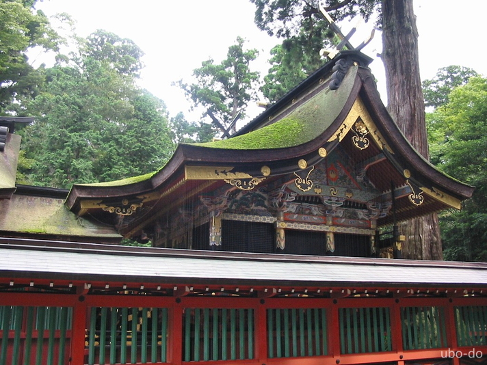 | 宝物・文化財 | 国宝: 「直刀」金銅黒漆塗平文拵 附刀唐櫃 (「ちょくとう」 こんどうくろうるしぬりへいもんこしらえ かたなからびつつき) 重要文化財: 本殿、石の間、幣殿、拝殿、仮殿、奥宮、桜門、「梅竹蒔絵鞍」 |